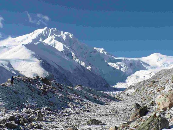 20-a. Reggel kilenckor indultunk neki az útnak. Itt háromnegyed nyolc körül kezd világosodni. Pekingi idő szerint számoljuk az időt. Felhős, de hál'Istennek nem melegben vágtunk neki a 3 órás fárasztó morénamezőnek. Ez úgy néz ki mint egy nagyon nagy bánya nagyon nagy meddőhányója, amit egy részeg rendező pakoltatott le hosszú vonalban. Nincs olyan kő, ami nem mozdul meg a lábunk alatt, ne csúszna el az alatta lévőn. Mire a végére érünk a köves hullámvasútnak, nyertünk szintben 200m-t, és veszítettünk egy tábor eléréséhez szükséges energiát, és egy adag lelkesedést. De nincs vége az "izgalmaknak"!