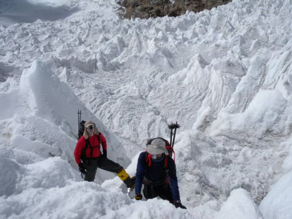 A depónál átvesszük a cipőnket, felvesszük a hágóvasat, jégcsákány a kézbe és irány a gleccser keresztezése. 5-10m-es jégtűre fel, majd le, majd ismét fel egy másikra és onnan is le. És ez így megy másfél órán keresztül. A túloldalra érve egyetlen métert sem emelkedtünk az egyes tábor felé. 5600m-en vagyunk. A gleccsert még nem sikerült felhős, szeles időben kereszteznünk, mindig egy forró katlanban másztunk. A változatosság kedvéért ismét beleléptam egy pocsolyába, úgyanúgy jobb lábbal. Hosszú, fárasztó káromkodás következett.