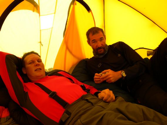 A gleccsertől felfelé el kezdett fújni a szél, és szép lassan jég is esett. Mire a táborhoz értünk komoly hó- és szélvihar volt, a sátrat le kellett takaritani a hótól, hogy hozzáférjünk a bejárathoz. Gulyást ettünk, majd gombalevest és sok-sok folyadékot ittunk utána. Mire végeztünk besötétedett. Gáz fölött elkezdtem szárítani a belső cipőmet. Egy órányi munka után korrekt eredményt értem el, használhatóvá vált a cipőm. Persze kellett még hozzá egy éjszakányi hálózsák melege. A szél és a hóesés nem csillapodott.